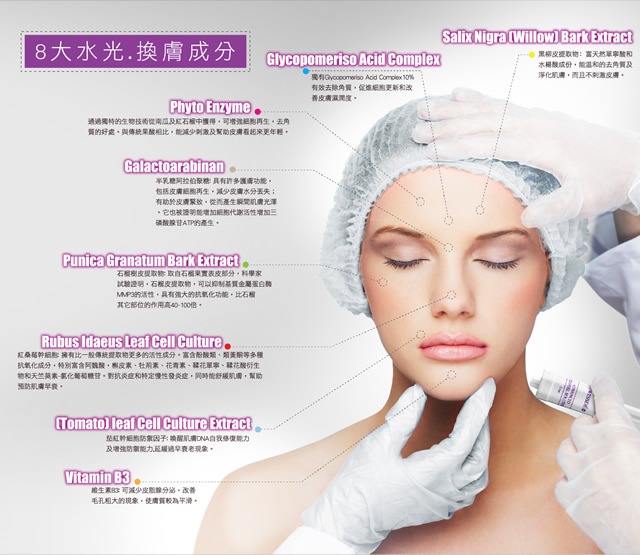 即時光滑肌膚、去除多餘角質、減淡皺紋、減淡暗瘡印、白哲肌膚
